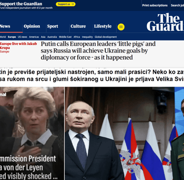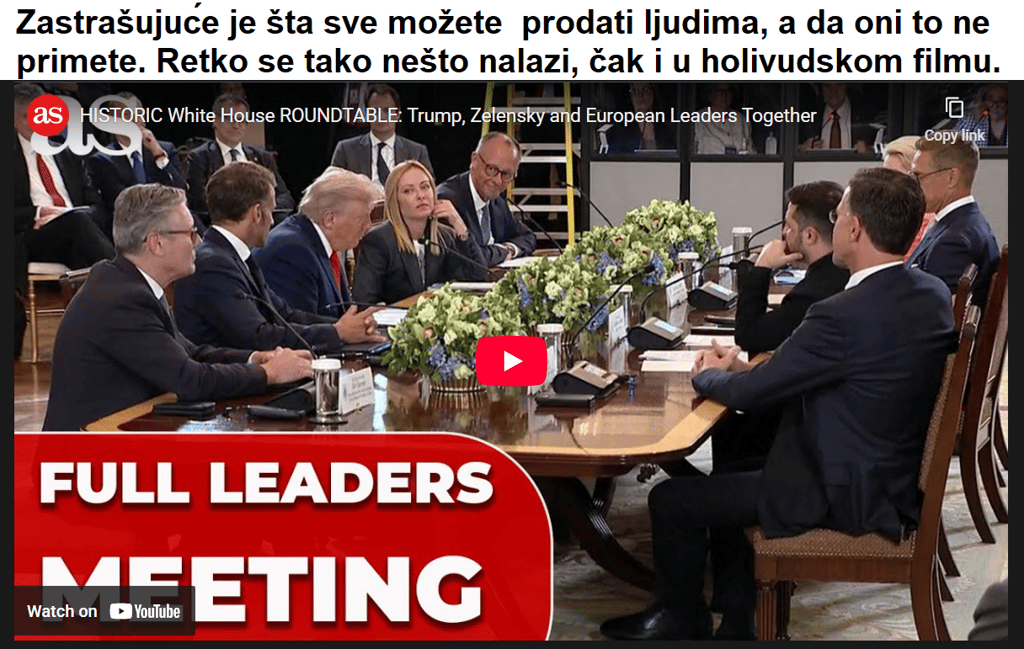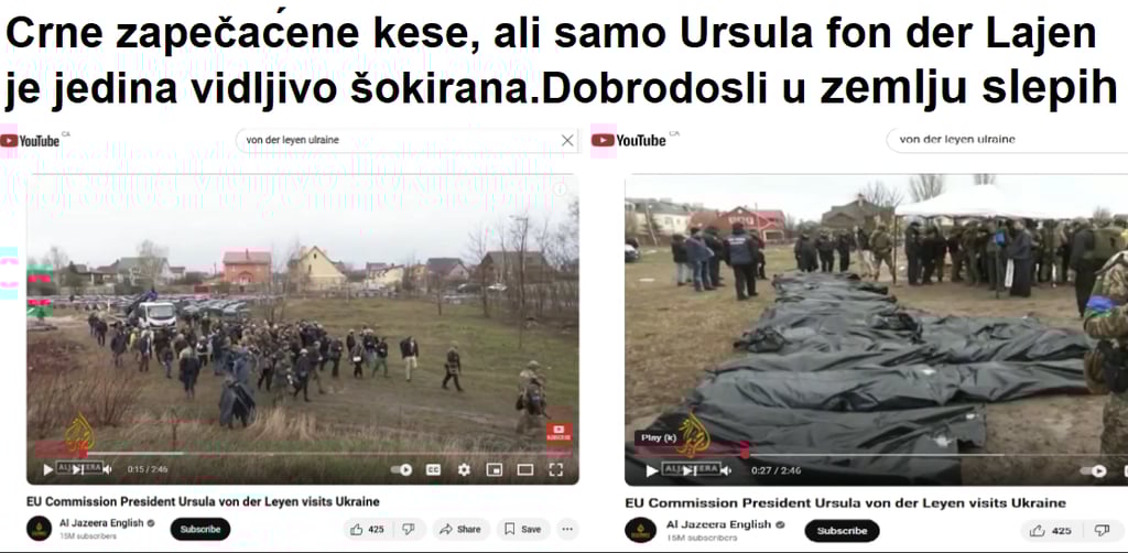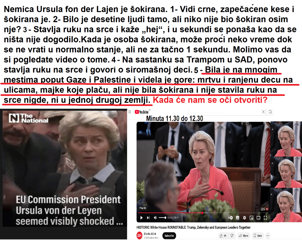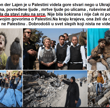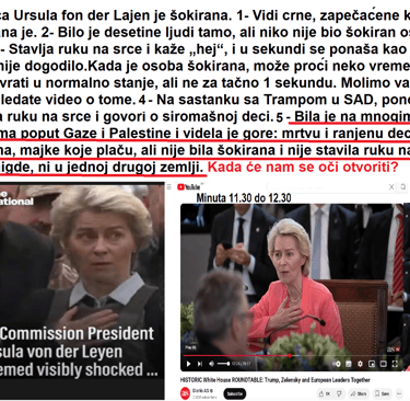 To je veoma tuzno gledat kako ih Nemci za budale imaju kad pogledate koliko ljudi ima ali samo Ursula von der Leyen je sokirana na video se vidiju crne zatvorene torbe I desetine ljudi ali samo Ursula von der Leyen je sokirana sa rukom na srcu to mozemo sada da zovemo Nemacki smrad.Nekoliko meseci kasnije drugi deo tog prljavog filma na sastanku sa trampu opet pocine da prica o deci . Ja sam majka, ja sam baka, jadna deca. Bila je na toliko mnogo mesta gde je videla ne samo crne vreće već i ranjenu i mrtvu decu, uplakane majke, uništene kuće, i nigde nije stavila ruku na srce, čak ni pomenula to. Ako pogledamo odeljak o nemačkoj istoriji na ovoj veb stranici, oni rade istu stvar od 1939. godine do danas 2025: siluju, muče, a u nekim slučajevima i ubijaju milione dece. Nažalost, ljudi imaju vrlo malo inteligencije i ne vide šta izvode, ovu šaradu sa rukom na srcu. Od 1939. do danas, 2025. godine, Nemci rade istu stvar iznova i iznova, i ona stavlja ruku na srce. Kako neko može biti toliko prljav i pokvaren da se tako pretvara pred ljudima? Čak ni Hitler nije uradio ništa slično.